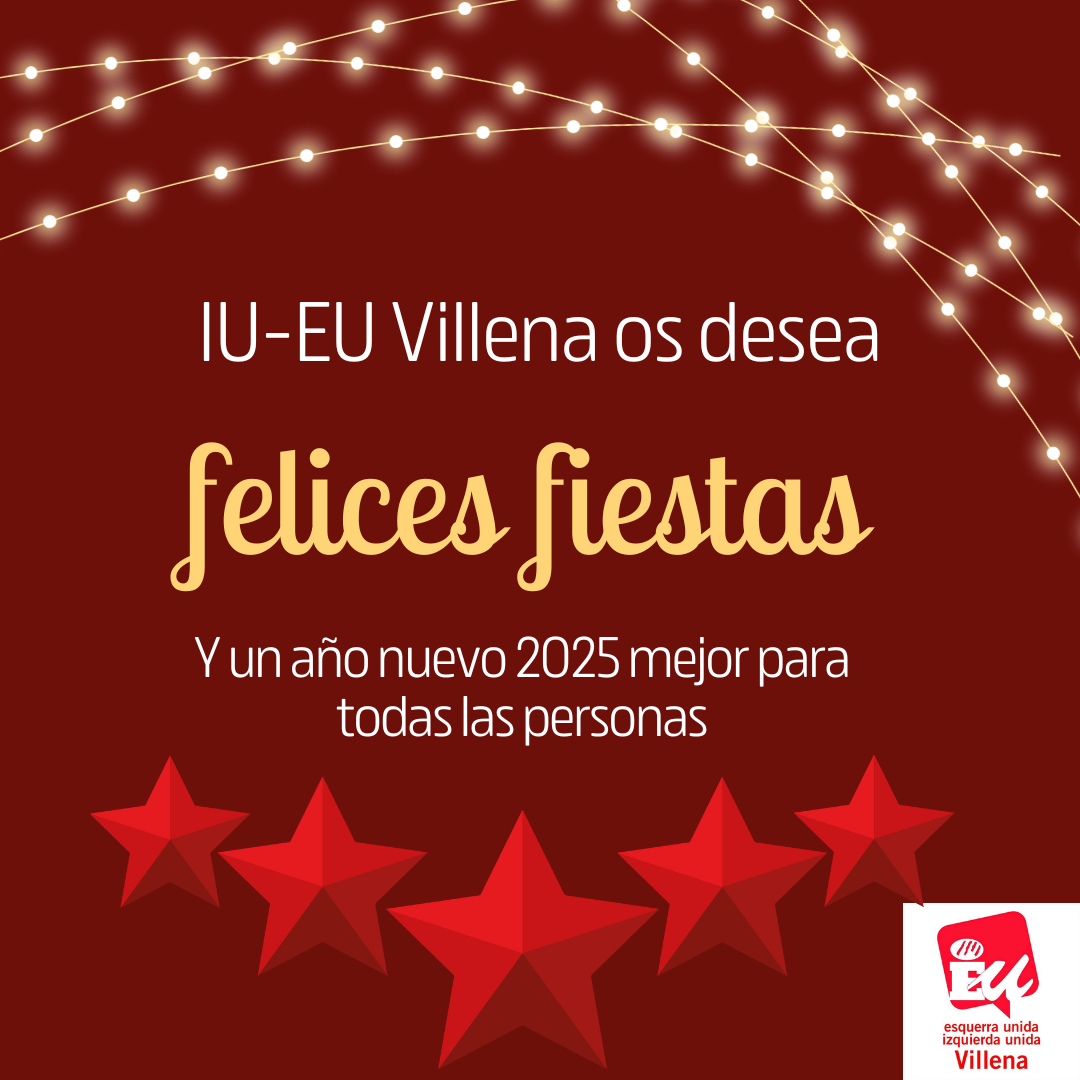Desde Izquierda Unida de Villena queremos transmitir en estas fiestas un mensaje de esperanza, lucha y solidaridad a todos los vecinos y vecinas de Villena. Un año más, a pesar de los retos y dificultades, nos mantenemos firmes en nuestra convicción de que un futuro mejor es posible para nuestro pueblo, especialmente para quienes más lo necesitan.