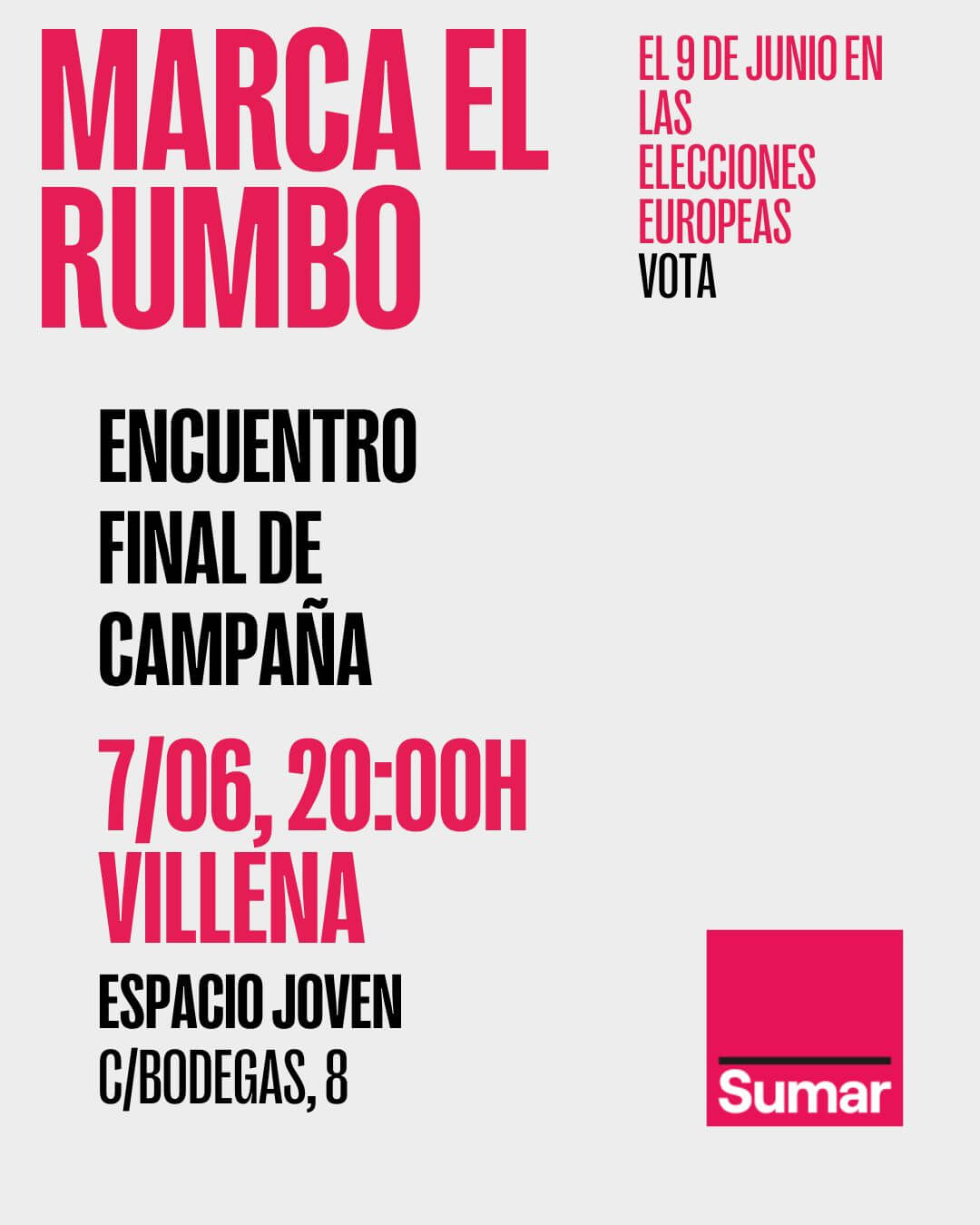 El domingo se votará sobre si la Unión Europa será abierta, solidaria, ecologista; si va a luchar por la justicia social, los derechos humanos, por la paz y por frenar el cambio climático o si, en vez de eso, la Unión (corta de miras) volverá a apoyar a los grupos privilegiados a costa de destrozar la naturaleza y desoír las necesidades de los más más desfavorecidos. Por eso, invitamos a la ciudadanía de Villena a este Encuentro Final de Campaña, para charlar, reflexionar sobre la Unión y disfrutar un rato juntos. ¡Nos vemos en el Espacio Joven a las 20:00h
