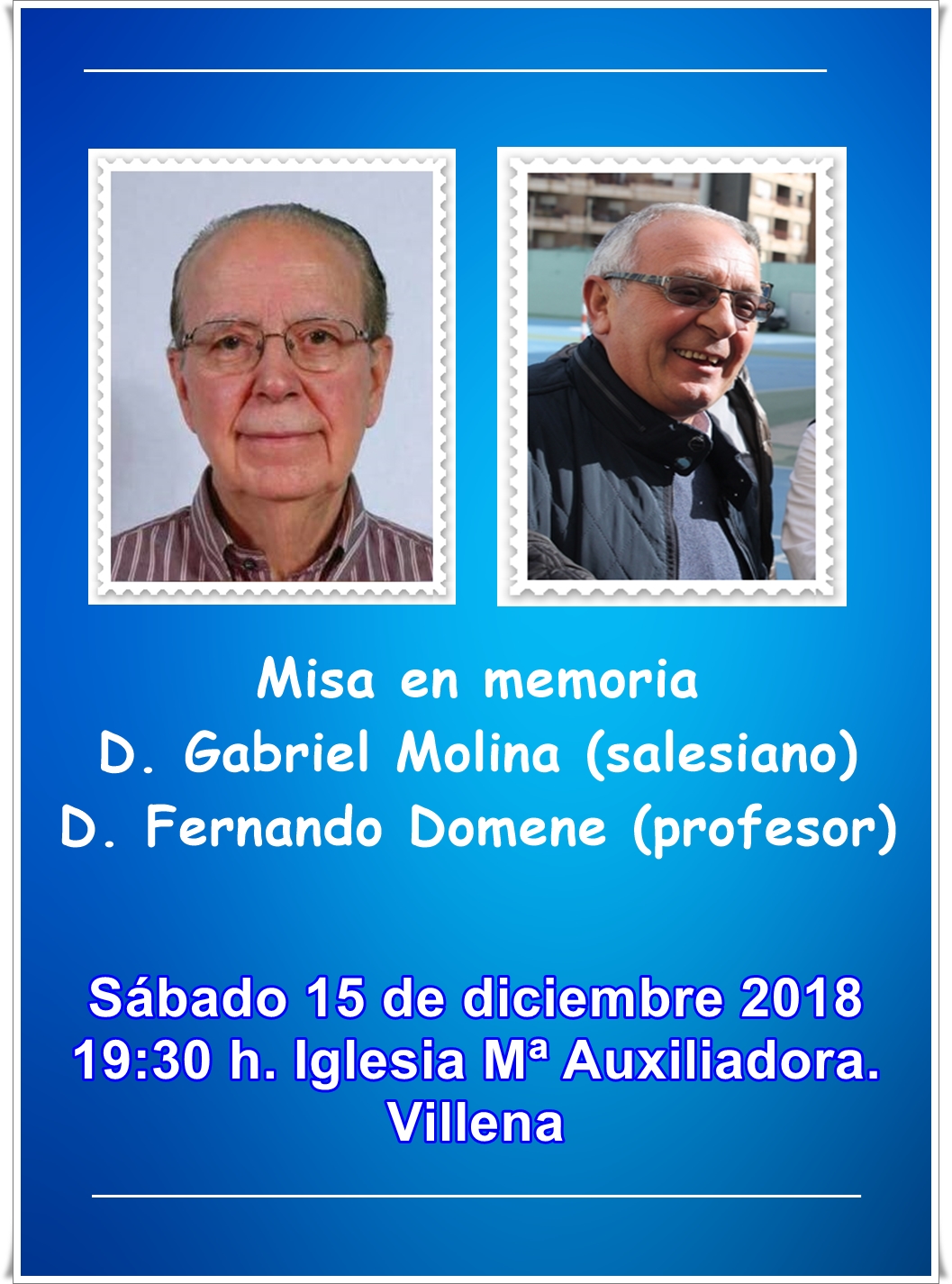 La Comunidad Salesiana de Villena, por medio de la promoción 1976-84, le invitan a la celebración de la Eucaristía en memoria del Salesiano D. Gabriel Molina (fallecido hace dos años) y del profesor D. Fernando Domene (fallecido hace justo un año).