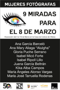 El próximo viernes día 3 de marzo con motivo de las actividades referentes al 8 de marzo, nueve mujeres de la Agrupación Fotográfica de Villena participan con una muestra fotográfica en la Casa de Cultura que permanecerá hasta el 19 de marzo. Os esperamos.