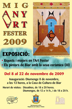 Expos. de pintura “Mig any/Art fester 2009″, que se inaugurará el próximo domingo día 8, a las 13 h., en la Casa de cultura-Biar, en colaboración con las Concejalías de Fiestas y de Cultura, dentro de los actos conmemorativos del medio año festero.