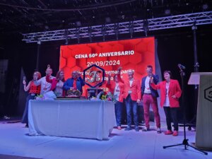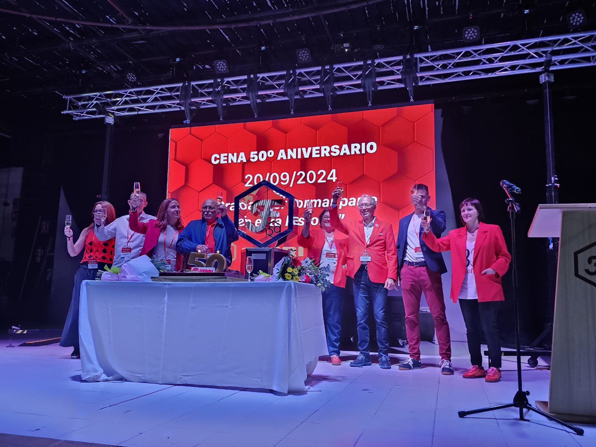 También los trabajadores dedicaron unas palabras de los hermanos Ferri, que siendo muy jóvenes, iniciaron la aventura empresarial que en 2024 cumple su medio siglo de historia y le hicieron entrega de un monolito diseñado por Anyel Martínez . Después llegó el momento de brindar y cortar la tradicional tarta.