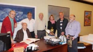 Miguel Ibern (sentado), junto con el señor alcalde y varios miembros de la comisión de El Salicornio en el acto de donación de diversos elementos del Chicharra.
