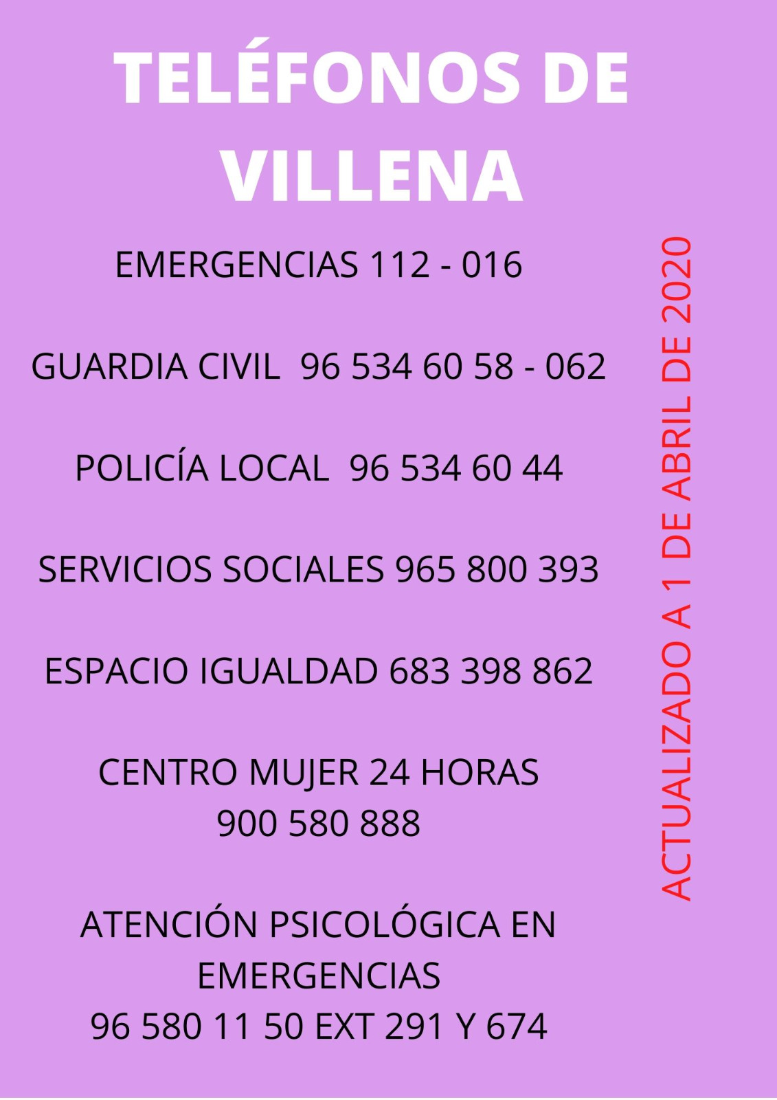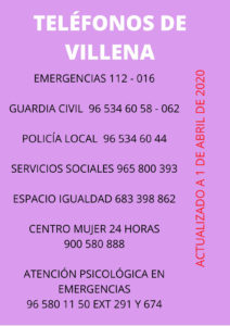 El teléfono de atención a víctimas de violencia de género es el 016. Además en Villena se encuentran habilitados los siguientes teléfonos: