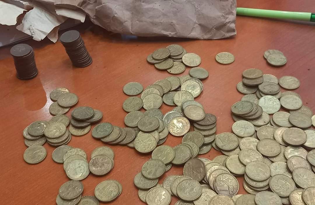 En ella han aparecido 283 monedas de peseta y 63 monedas de 50 céntimos, todas ella de la república acuñadas en 1937. Estaban dentro de un sobre, el de la fotografía, que reza: “Dinero Rojo y Recibo de Entrga de Banco, julio 1938, Español”.