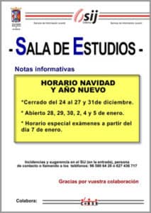 La Concejalía de Educación del Ayuntamiento de Villena ha establecido los nuevos horarios de la Sala de Estudios para las próximas fechas de navidad y año nuevo: