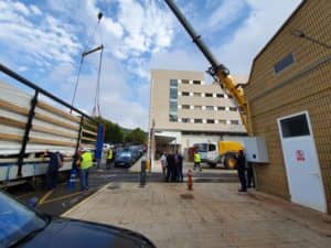 Para el traslado del equipamiento han sido necesarios dos camiones de amplio tonelaje y la instalación de una grúa de gran calibre.