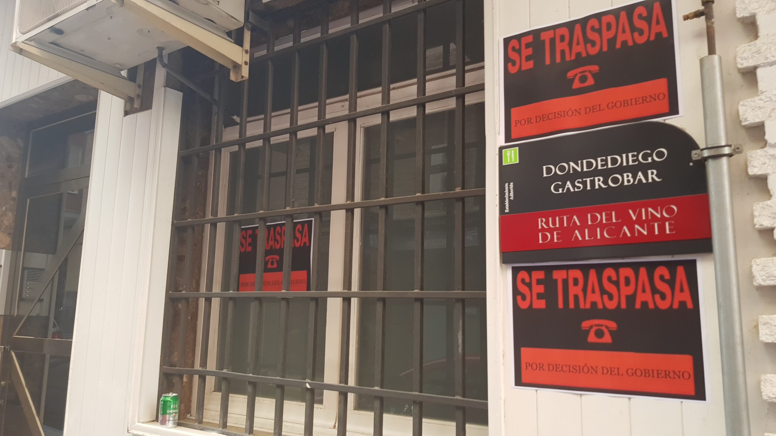 Varios hosteleros de Villena han colgado el cartel de “Se traspasa” como muestra de protesta contra las medidas establecidas por el Gobierno de España para llevar a cabo la desescalada y que establece la apertura de las terrazas al 50% de su aforo.