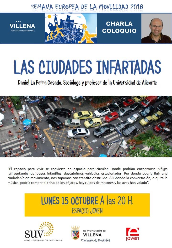 Este lunes 15 de octubre a las 20h, en el Espacio Joven, arranca la Semana de Movilidad de Villena con una interesante charla organizada por la Sede Universitaria de Alicante y la Concejalía de Movilidad del Ayuntamiento de Villena, titulada “LAS CIUDADES INFARTADAS”. Una charla impartida por Daniel La Parra Casado. Sociólogo y profesor de la Universidad de Alicante. Además de su perfil de investigador social en cuestiones sociales y de movilidad, Daniel La Parra es un activista en el ámbito de la movilidad sostenible desde hace años.