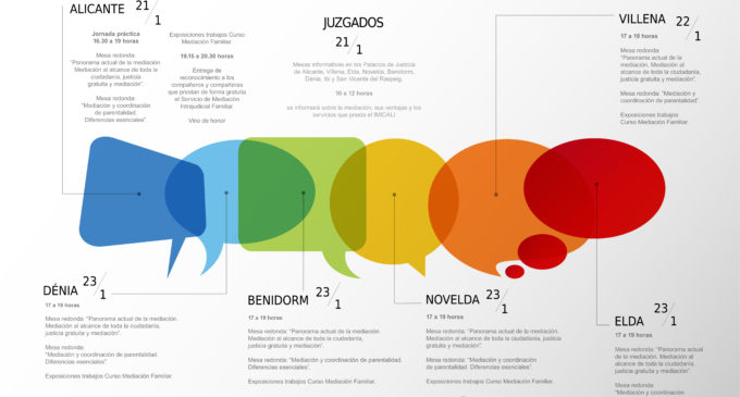Las delegaciones del Ilustre Colegio de la Abogacía de Alicante (ICALI) en Villena, Elda y Novelda se suman a las actividades organizadas con motivo del Día Europeo de la Mediación, que se celebra cada año el 21 de enero. En esta jornada, se instalará en el Palacio de Justicia de las tres localidades una mesa informativa en la que los miembros del Instituto de Mediación del ICALI (IMICALI) darán a conocer tanto a la ciudadanía como a los profesionales de la abogacía y la judicatura las ventajas de la mediación como método alternativo a la resolución de conflictos.