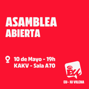 Por ese motivo, el próximo martes 10 de mayo, a las 19 horas, en la Sala A70 de la Casa de Cultura, se celebrará la Asamblea del grupo Izquierda Unida de Villena, y estará abierta tanto a personas afiliadas como a simpatizantes.