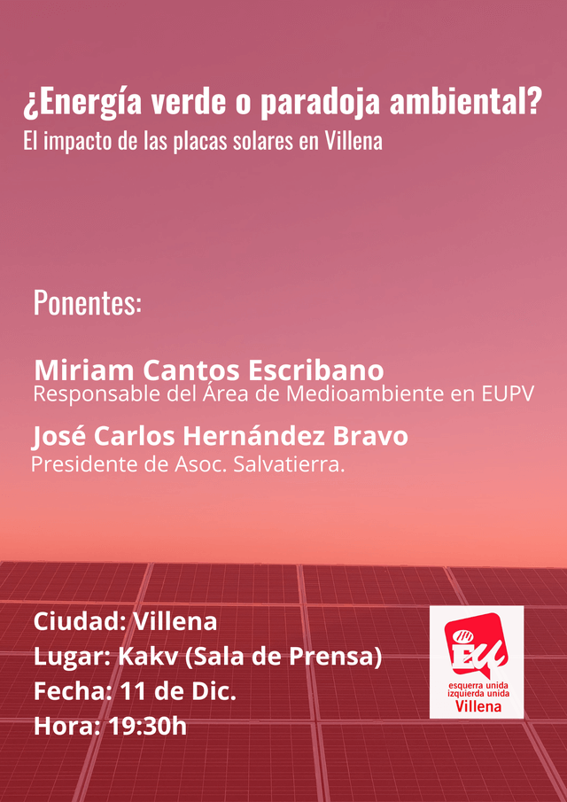 Para ello, contarán con dos ponentes. Por un lado, Miriam Cantos Escribano, responsable del área de Medioambiente de EUPV, hablará sobre la situación de las renovables de un modo más amplio, abordando también otras zonas próximas. Por otro lado, José Carlos Hernández Bravo, presidente de la Asociación Salvatierra, se centrará en la problemática en el municipio de Villena.