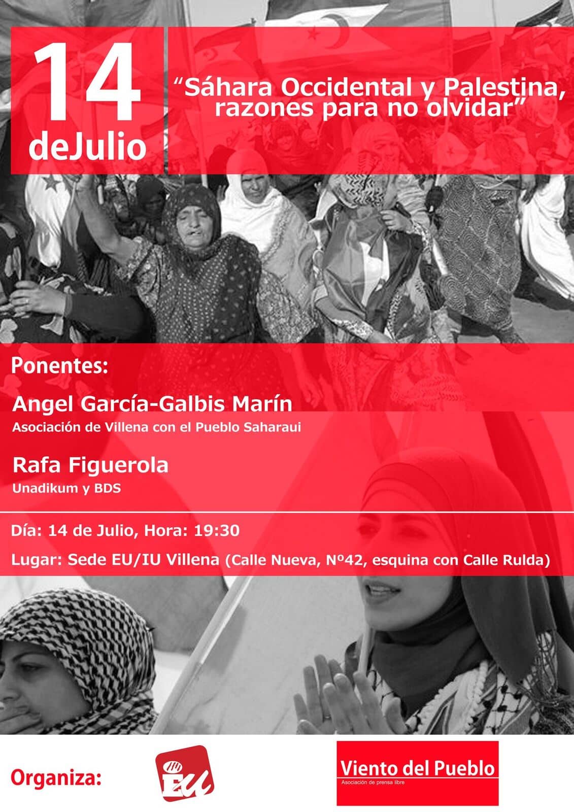 Desde Izquierda Unida de Villena queremos invitar a la ciudadanía a una charla llamada “Sáhara Occidental y Palestina, razones para no olvidar”, en la que tendremos el gusto de presenciar a Ángel García-Galbis Marín (de la Asociación de Villena con el Pueblo Saharaui) hablándonos de la situación del Sáhara Occidental y su historia. También podremos escuchar a Rafa Figuerola, de Unadikum y BDS, que viene desde Alcoy para hablarnos de Palestina.