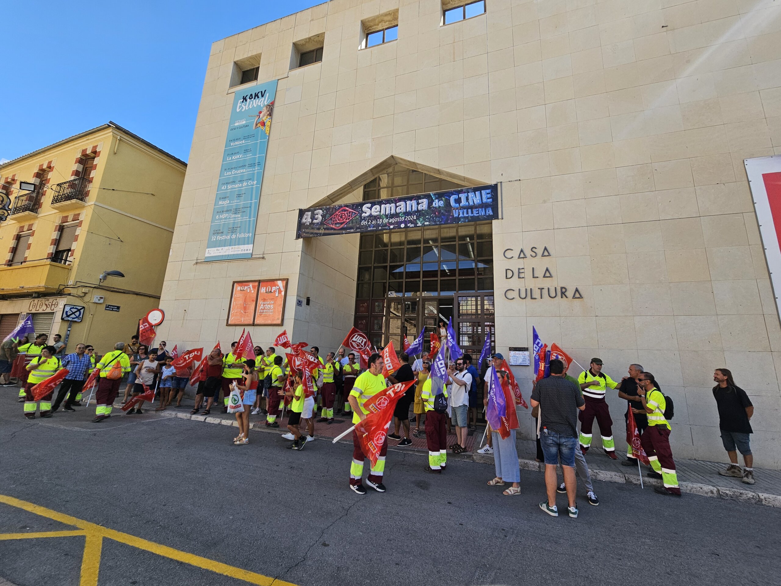 Izquierda Unida Villena se suma a las protestas y reivindicaciones de los trabajadoras y trabajadores del Servicio de Limpieza Viaria (LV) y Residuos Sólidos Urbanos (RSU), quienes desde el día 20 de agosto a las 11.00 de la mañana, están manifestándose en la plaza de Santiago.