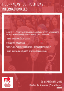 Por ello, hemos organizado unas Jornadas sobre Políticas Internacionales que se llevarán a cabo el sábado 28 de septiembre en el Centro de Mayores (Plaza Mayor) por la tarde.