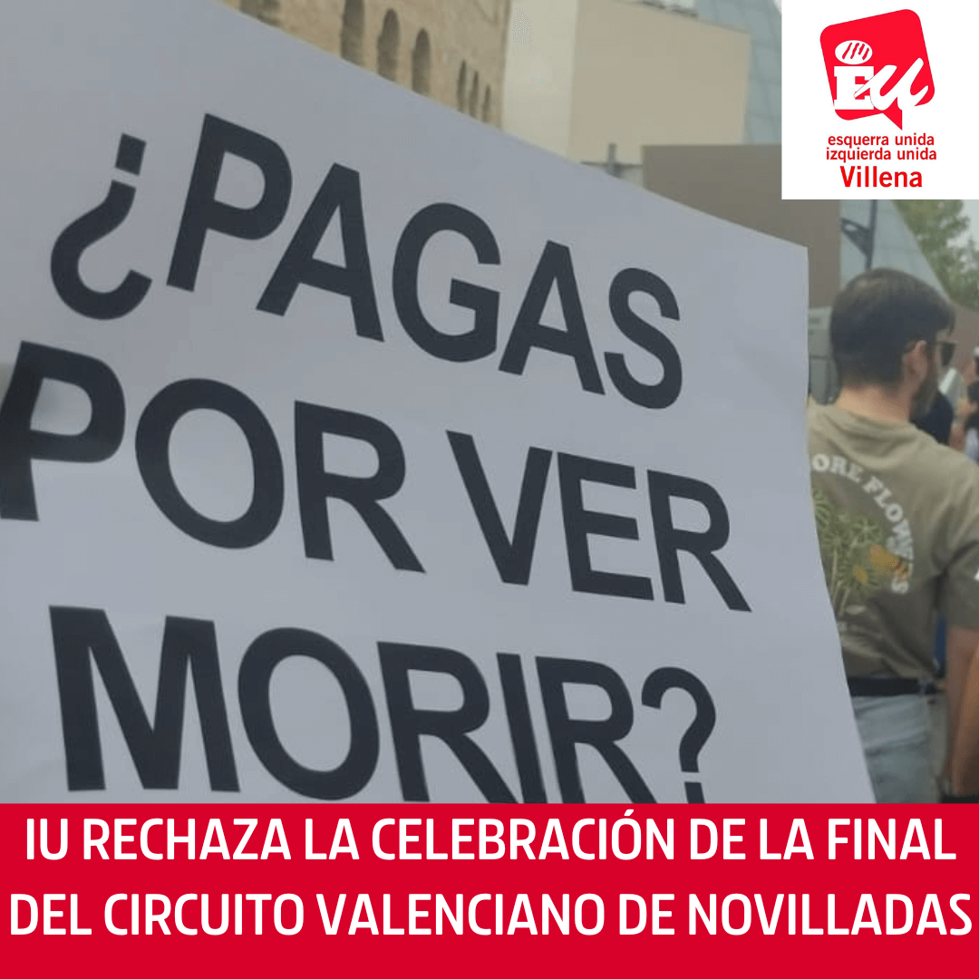 Desde el colectivo de Izquierda Unida de Villena nos sumamos a la concentración convocada por la Plataforma Animalista el próximo 6 de octubre, a las 10:30h, en las inmediaciones de la plaza de Toros. Invitamos a toda la ciudadanía a participar en esta manifestación en defensa de los derechos de los animales y en contra del maltrato animal. Reafirmamos nuestro rechazo contra este tipo de espectáculos, que no representan cultura ni arte, sino crueldad.