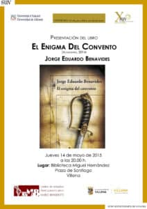 El próximo jueves, 14 de mayo a las 20,00 h. y gracias a la organización de la Sede Universitaria de Villena y el Centro de estudios iberoamericanos Mario Benedetti, tendremos el placer de recibir a Jorge Eduardo Benavides, para hablarnos de su novela El enigma del convento, con la que ha obtenido recientemente el Premio de Novela Gonzalo Torrente Ballester