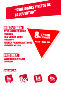 El área de juventud de Izquierda Unida de Villena organiza una conferencia llamada “Realidades y retos de la juventud” para el sábado 8 de febrero a las 17:30h en la Casa de Cultura (KAKV) de Villena, en el aula A70.