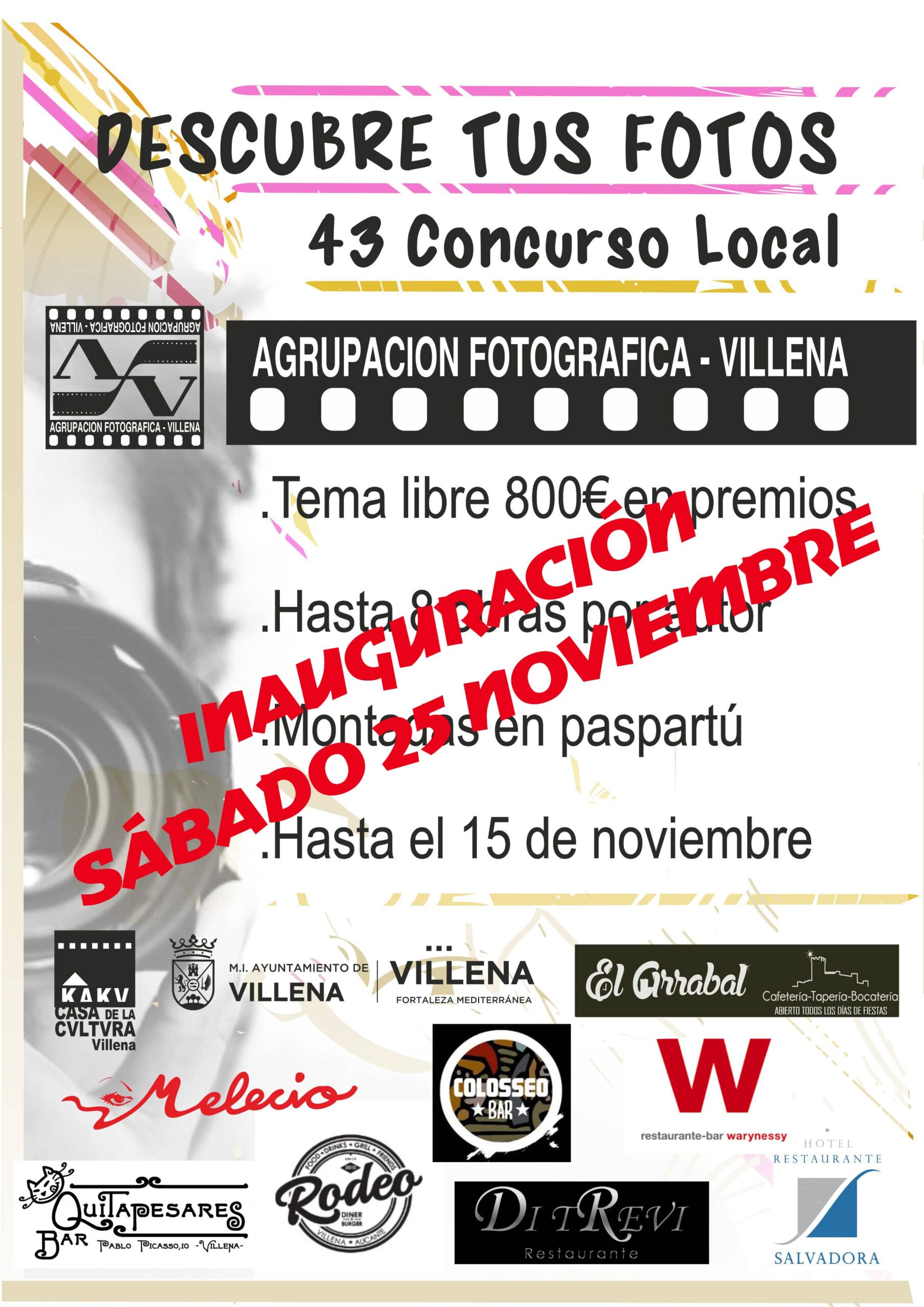 La Agrupación Fotográfica Villena inaugurará las exposiciones en los locales colaboradores el sábado 25 de noviembre a partir de las 10 de la mañana. 178 fotografías de 35 autores hasta el 17 de diciembre, de esta forma se prentende llegar a más aficionados y compartir con más personas el trabajo de los amantes de la fotografía.