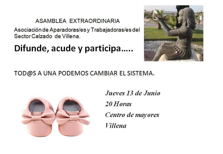 La asociación de Aparadoras/es y Trabajadoras/es del sector calzado de Villena convoca una asamblea extraordinaria para el próximo jueves 13 de junio a las 20 horas en el Centro de Mayores de Villena.