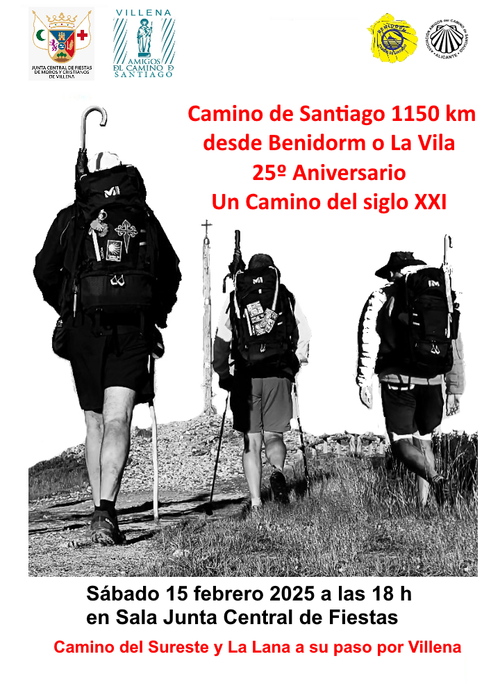 La asociación Amigos del Camino de Santiago de Villena, ha organizado la tarde del sábado 15 de febrero de 2025 a las 18 h. en el salón de actos de la casa del Festero, una conferencia denominada “Un Camino del siglo XXI . Camino de Santiago 1150 kilómetros desde Benidorm o la Vila. 25 aniversario”