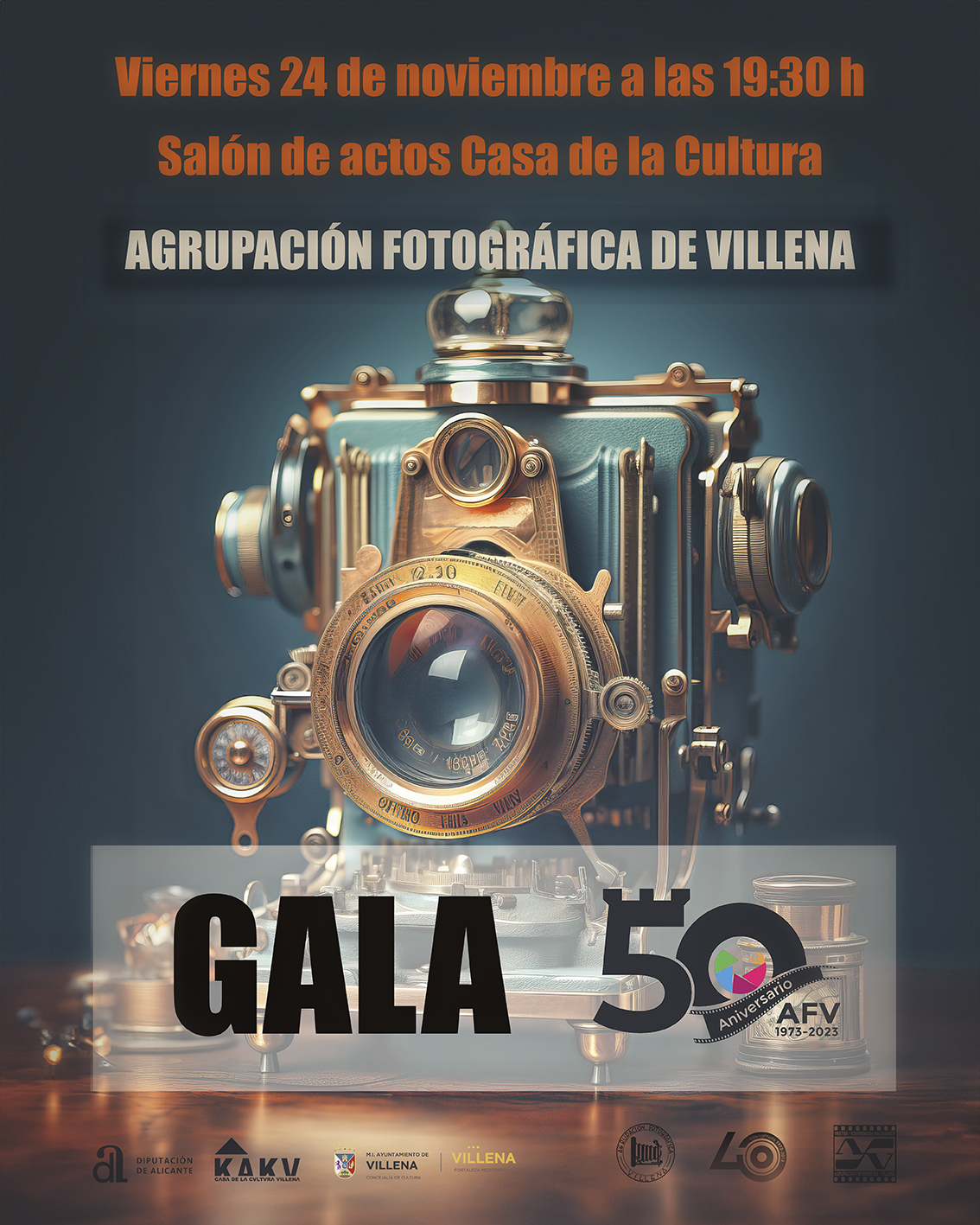 Y todos estos actos tendrán su colofón en la Gala de Aniversario que se celebrará el día 24 de noviembre en el salón de actos de la Casa de la Cultura de Villena. Donde se hará un emotivo recorrido por estos 50 años de vivencias, con videos, música Jazz a cargo de Sound and Music y como no, de fotografía. Durante el acto se presentará el libro realizado con motivo de la conmemoración de este aniversario, donde se recoge la historia de la AFV, anécdotas, un sinfín de datos y muchas fotografías. Será una noche de celebración, de recuerdos, de emociones, que se quiere compartir con toda la ciudadanía que quiera acompañar a esta Agrupación que cumple 50 años.