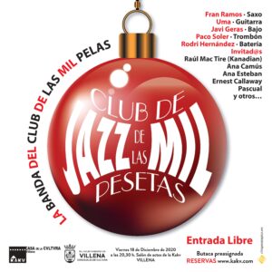La Banda del Club de las Mil Pelas cerrará el año de conciertos organizado por el Club de Jazz de las Mil Pesetas. El concierto será el próximo viernes 18 de diciembre a las 20.30 horas en el salón de actos de la Casa de la Cultura de Villena.