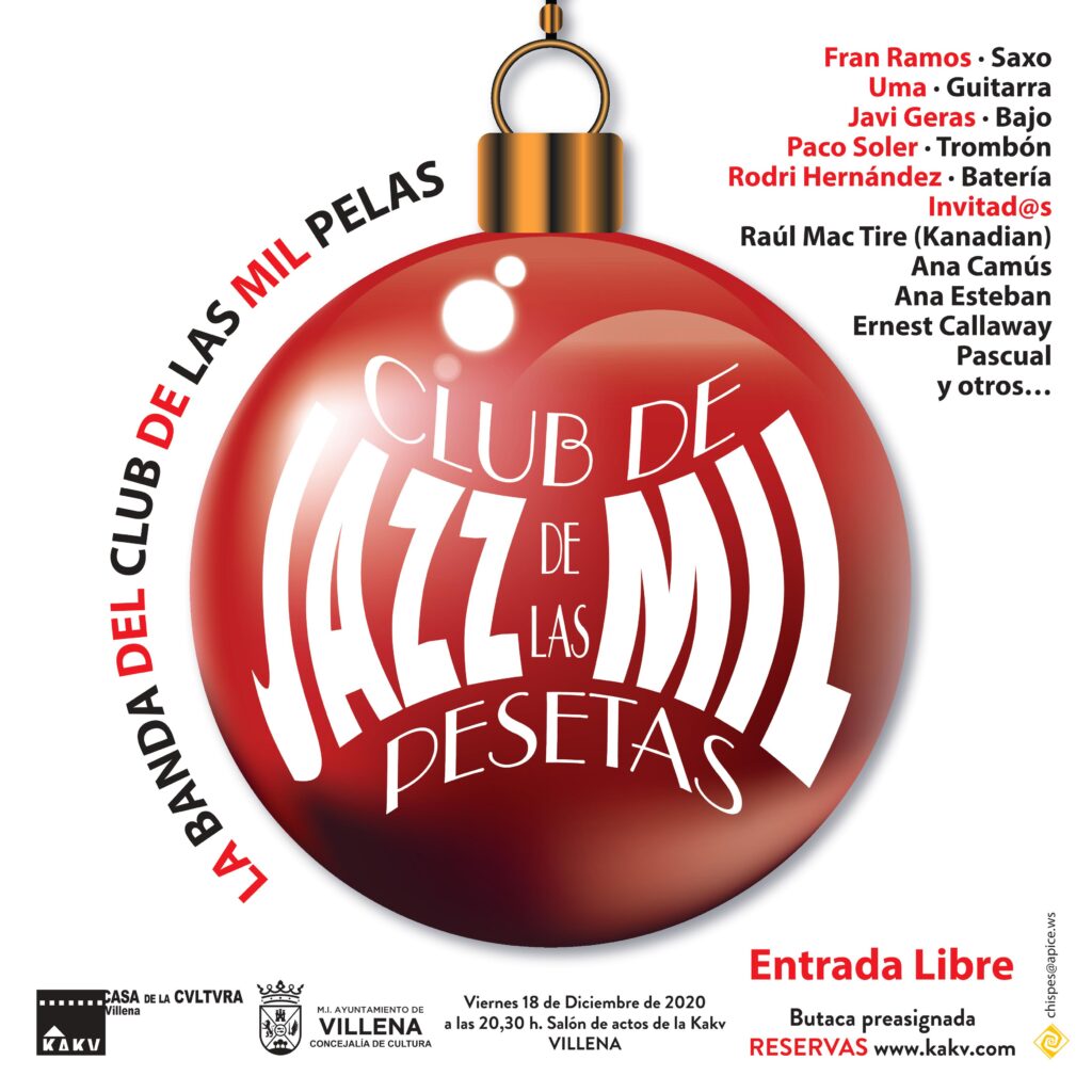 La Banda del Club de las Mil Pelas cerrará el año de conciertos organizado por el Club de Jazz de las Mil Pesetas. El concierto será el próximo viernes 18 de diciembre a las 20.30 horas en el salón de actos de la Casa de la Cultura de Villena.
