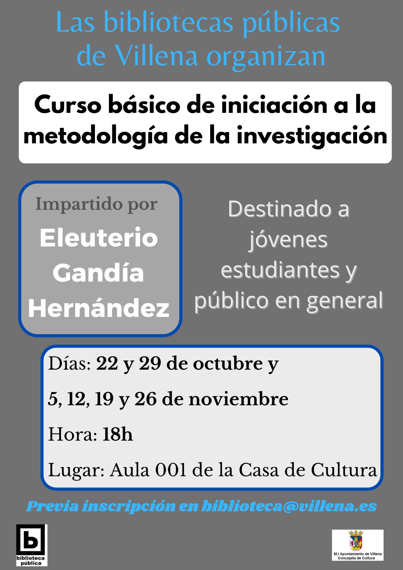 La Biblioteca Pública Miguel Hernández de Villena ha organizado el primer Curso Básico de Iniciación a la Metodología de la Investigación orientado al público en general, pero especialmente a los más jóvenes con inquietudes o necesidades en este ámbito. El ponente del este curso será Eleuterio Gandía, un hombre intelectual que ha destacado por sus investigaciones y en el mundo de la creación poética.