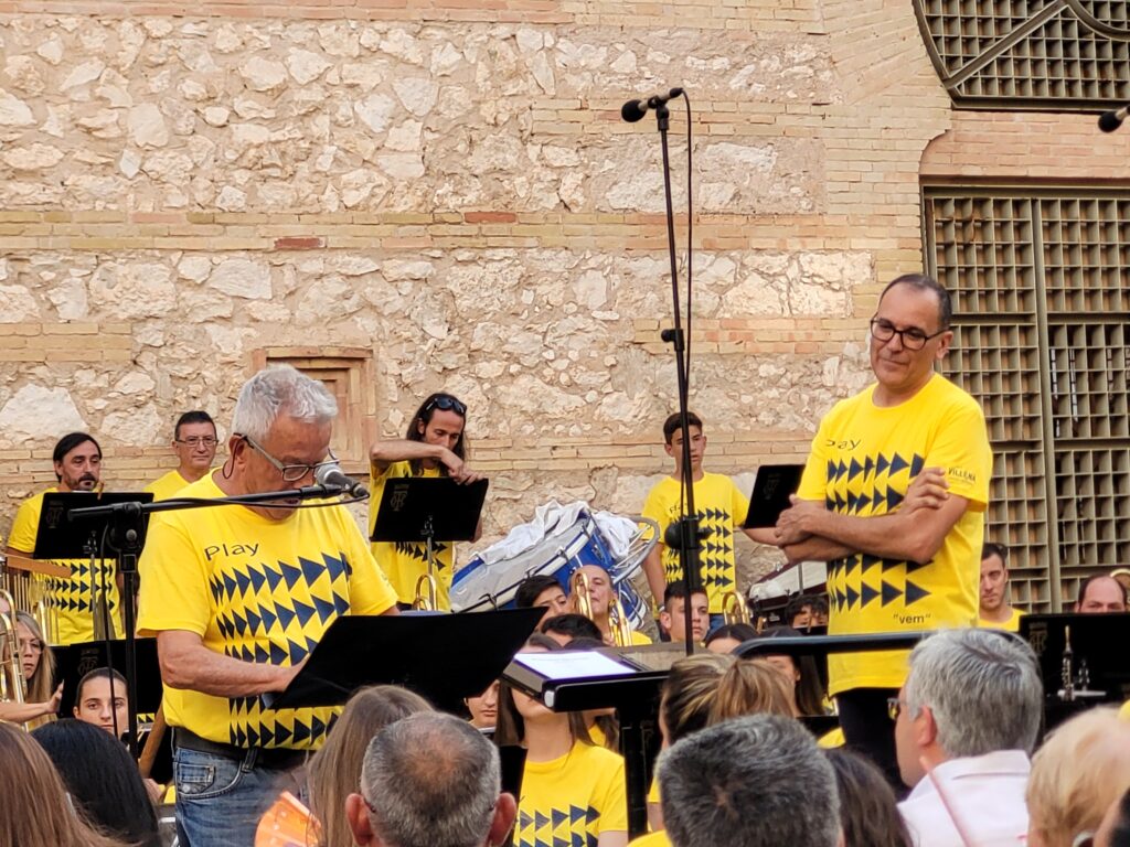 Pepe Ferri, musico de la banda, ha sido el encargado de poner la primera voz al pregón, quien ha relatado los inicios de la BMM y como la entidad ha sido el germen de muchas de las actividades entidades y actividades musicales y culturales de Villena. La BMM y la juvenil, en una sola, han puesto la banda sonora al inicio del VEM, al grito de “Yo soy de la banda”.