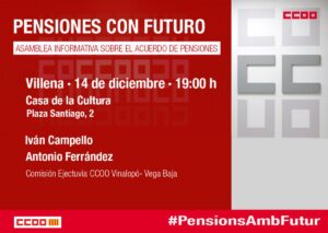 Hoy martes 14 de diciembre por la tarde a las 19h en la Casa de cultura de Villena tendrá lugar la asamblea informativa sobre el nuevo acuerdo de pensiones.