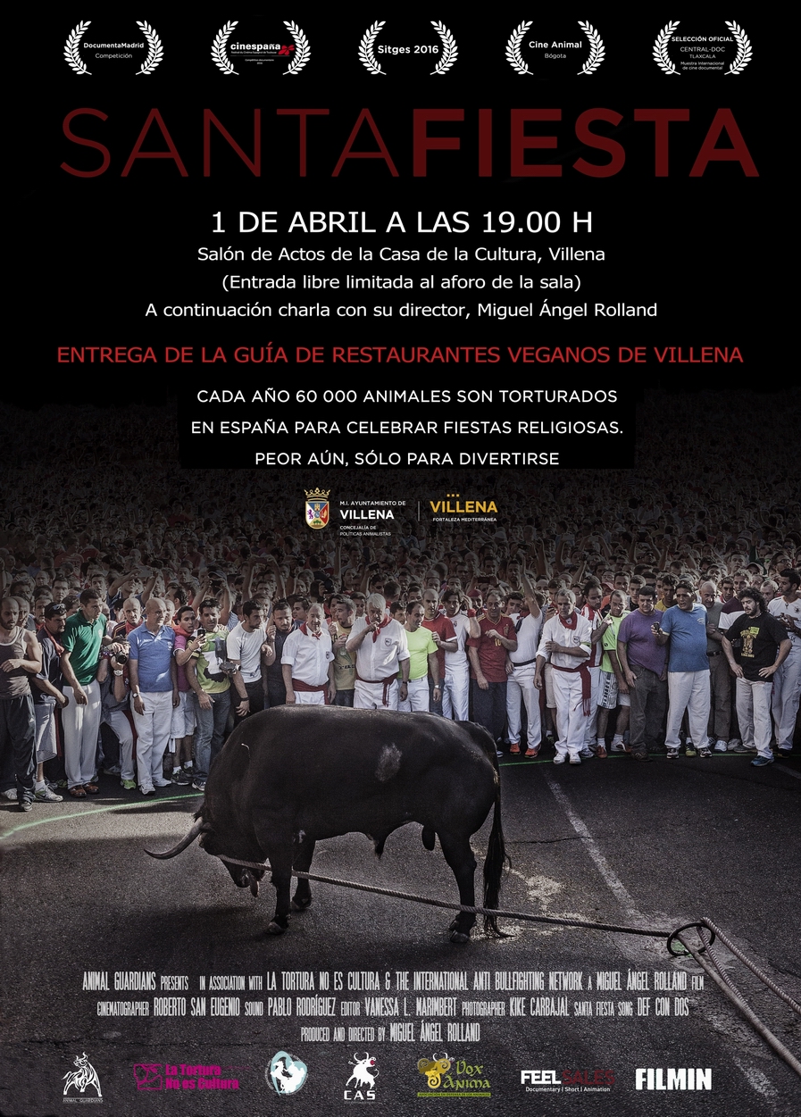 La concejalía de Políticas Animalistas trae a Villena la proyección de la película “Santa Fiesta” la cual narra la historia de los festejos donde participan animales en España de una forma jamás contada anteriormente, el sábado 1 de abril en la Casa de Cultura con entrada libre.