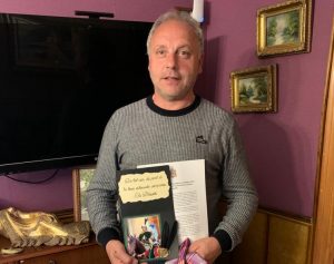 Pese a las circunstancias de excepción que han presidido los días más grandes de Biar, la Comparsa de “Blavets” ha decidido no dejarse vencer ante tales condicionantes y celebrar la efeméride que este año tenía preparada. El presidente de la Comparsa, en representación de la misma, procedió a entregar al embajador, Jaime Coloma Ferrándiz, un detalle en conmemoración del 25º aniversario de su primera embajada. Ostentando de forma ininterrumpida desde 1995 el cargo de embajador cristiano de la Villa de Biar, la Comparsa de Cristianos “Els Blavets” le otorga dicho homenaje en reconocimiento por su desinteresada labor festera y por su impecable desempeño a lo largo de su extenso período como embajador.