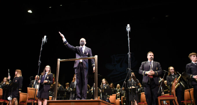 Pero la gran sorpresa era la presentación del nuevo pasodoble dedicado a la comparsa de Estudiantes de Villena. Compuesto por Gaspar Ángel Tortosa Urrea y con el título “Estudiantes de Villena”, se estrenó al final de la primera parte del concierto bajo la dirección del propio autor. Se trata de una composición muy alegre y ligera, con muchos toques característicos del compositor. Una vez interpretada fue gratamente ovacionada por los asistentes. El autor dedicó unas palabras explicando y dando detalles del porqué de su composición, además de dejar un deseo el cual compartimos todos, que era el poder disfrutar de “nuestro” pasodoble en la calle para así olvidarnos de estos tristes años. El concierto finalizó con una nueva interpretación del pasodoble “Estudiantes de Villena” pero, en esta ocasión, cantado con la letra escrita por Mª Virtu Pardo Sánchez, siendo una vez más, ampliamente aplaudido.