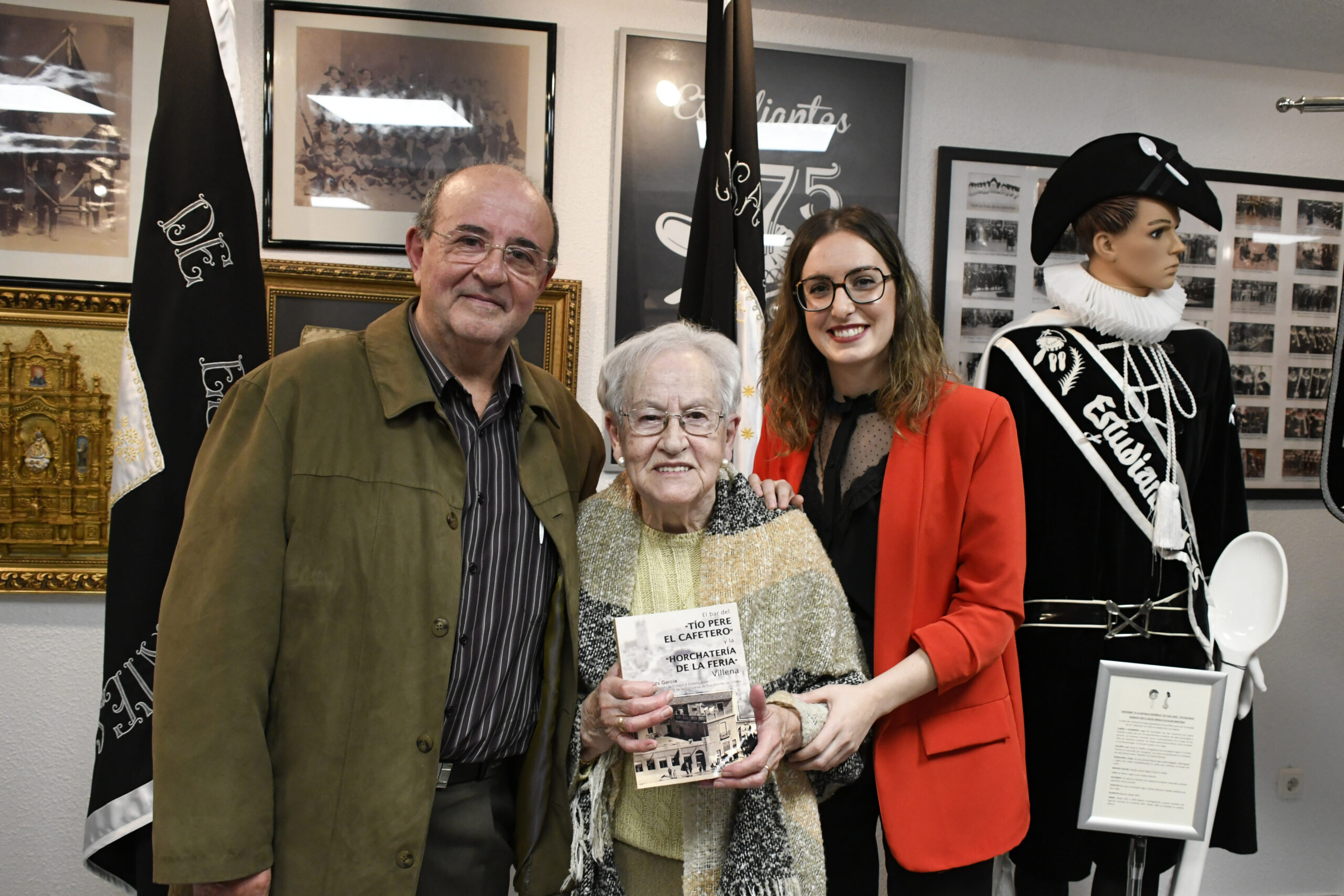 Tras las palabras introductorias de los tres primeros, presentó el libro Mariana García López, descendiente del protagonista del mismo, quien realizó un resumen muy detallado de todo lo que el lector va a poder encontrar en las páginas de este trabajo; los personajes que nos trasladan desde el siglo XIX, como el propio “Tío Pere el Cafetero”, Pedro Clemente Catalán, hasta los últimos propietarios del establecimiento que vio cerrar sus puertas en 1976, Paco y Mariana; las situaciones y costumbres de las diferentes épocas que se vivieron en el bar, así como su derribo en 1979. Tras esta introducción, intervino el autor del libro, quien agradeció a la comparsa de Estudiantes su apuesta firme por la cultura con este galardón y, además, la presencia de los anteriormente nombrados, Paco y Mariana, sus tíos, y de sus primos, con quienes pasó largos periodos de tiempo en su infancia y juventud en el bar del “tío Pere el Cafetero”. En su intervención, hizo un alegato a sus recuerdos y vivencias, sin desgranar lo que puede leer quien pretenda disfrutar de este libro. Una vez finalizada la presentación y las diferentes dedicatorias a todos aquellos que así lo quisieron, el autor firmó en el libro de honor de la comparsa, dándose por finalizado el acto en sí.