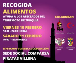 La Comparsa de Piratas en solidaridad con los afectados del terremoto de Turquia, promueve una recogida de alimentos no perecederos y productos de higiene en colaboración con la Junta Central de Fiestas y el Ayuntamiento de Villena.