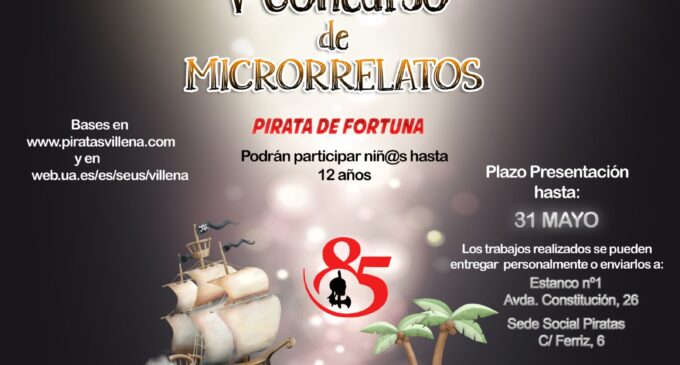 PIRATAS DE FORTUNA. Así es el lema que La Sede Universitaria en Villena y la Comparsa de Piratas ha escogido para celebrar el V Concurso de Microrrelatos. El objetivo de ambas asociaciones es seguir manteniendo este vínculo socio cultural que como quinto año consecutivo vienen haciendo para promover la creatividad literaria de los niños y niñas hasta 12 años a los que se les da la oportunidad de demostrar lo atrevida y aventurera que puede llegar a ser su imaginación.