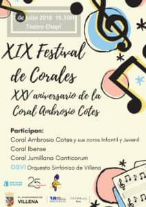 La Coral Ambrosio Cotes ha organizado el XIX Festival  de corales “Ciudad de Villena” en el Teatro Chapí, será el 7 de julio a partir de las 19.30 horas.
