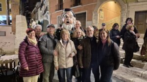 La familia Marco, con el recién creado cabezudo de Pedro Marco, t han querido acompañar al Salicornio con la reivindicación de la construcción de la Torre del Orejón y que vuelva el Archivo Municipal a Villena.