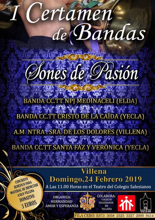 La Hermandad del Amor y la Esperanza organiza su primer certamen de bandas, con las mejores bandas de la comarca y esta vez, el beneficio íntegro de las entradas, será donado en favor del Asilo de Villena, para el revestimiento de los utensilios que soliciten las hermanas para el nuevo edificio que están construyendo. El lugar escogido para dicho certamen será el teatro del Colegio Salesianos de Villena, el próximo Domingo día 24 de Febrero a las 11:00 horas. La hermandad del Amor y Esperanza les agradece su colaboración.