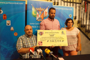 El presidente de la Junta Central de Fiestas de Villena, Antonio Navajas, entregó al presidente de AMIF, Antonio Ruescas, un cheque por valor de 1.665 euros, dinero recaudado tras la cena solidaria organizada por la entidad festera el pasado 15 de agosto.  El presidente de la entidad festera, tras el éxito de participación, adelantó que el año que viene se organizará una nueva cena solidaria a beneficio de otra asociación local