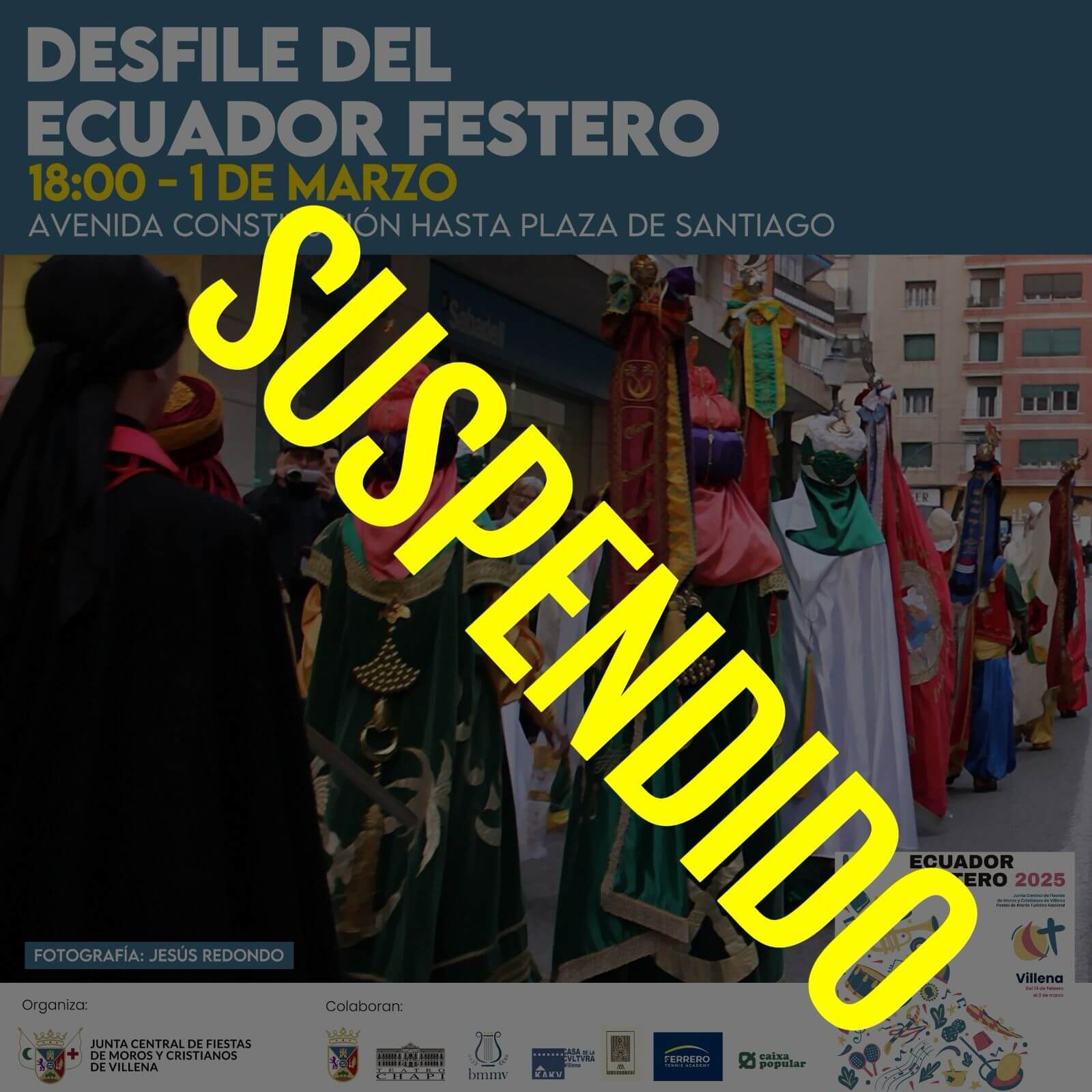 Debido a la situación meteorológica y después de consultada toda la información con la que contamos, se ha decidido la suspensión del Desfile del Ecuador Festero y del concierto de La Espartera.
