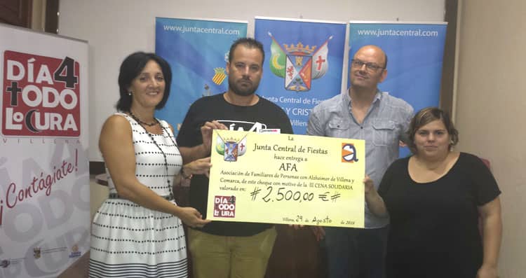La Junta Central de Fiestas ha entregado a la asociación de familiares de enfermos de Alzheimer de Villena y comarca un cheque con 2.500 euros, el dinero recaudado de la cena benéfica que la entidad festera organizó el pasado 14 de agosto.