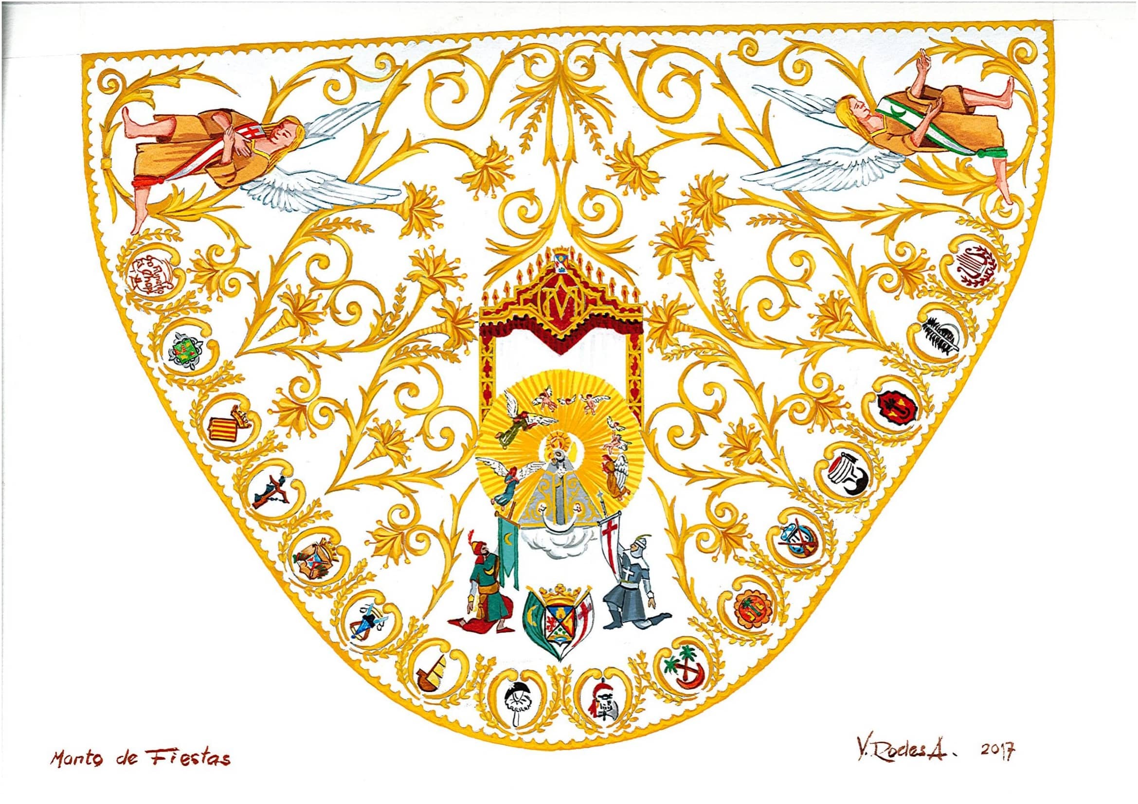 Un Manto, cuyo boceto inicial ha sido diseñado por D. Vicente Rodes Amorós y que ha sido denominado el Manto de Fiestas. Una prenda dedicada a nuestras Fiestas Patronales de Moros y Cristianos. Un conjunto textil donde aparecen los emblemas de las catorce comparsas, Junta Central, Banda Municipal y Sociedad Musical Ruperto Chapí, así como el escudo de la ciudad. Un diseño exclusivo donde se puede apreciar el trono que se sitúa cada año en la Arcedianal Iglesia de Santiago Apóstol y donde la Patrona, elevada entre ángeles y nubes, se encuentra escoltada por estandartes con la cruz y la media luna.
