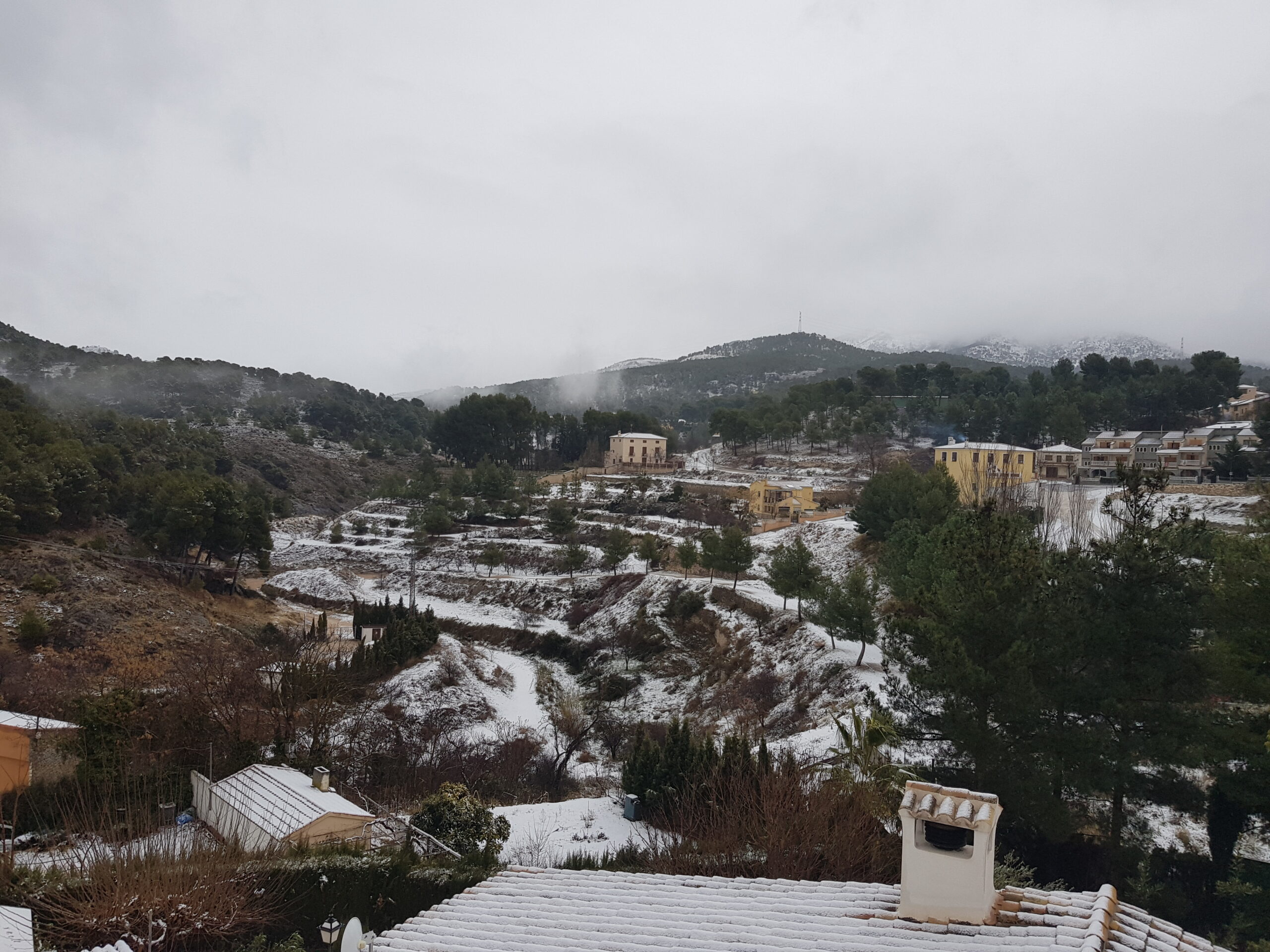 En la tarde de ayer cayeron los primeros copos pero la nieve no cuajó. Ha sido en la madrugada del jueves a viernes cuando los tejados del municipio se han cubierto de blanco. De momento se puede transitar por casi todas las carreteras de acceso a la población aunque se recomienda evitar el enlace con Castalla.