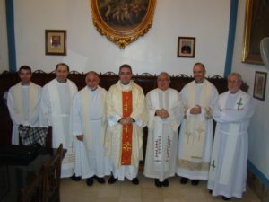 José Abellán, Vicente Alonso, Manuel Martínez, Ildefonso López, Paco García y José Luis Casanova concelebraron la eucaristía junto al administrador parroquial, Ángel Bonavia. También, asistieron a la ceremonia el presidente de la asociación de vecinos de las Virtudes, Antonio Calabuig. el presidente de la Agrupación de Navidad y Reyes, Vicente Amorós, el presidente de la Junta de la Virgen, Antonio López así como concejales del Ayuntamiento de Villena y la diputada autonómica, Mª José García Herrero.