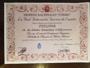 El presidente y miembros de la directiva de la Peña Cultural Taurina Villenense, ayer domingo 25 de febrero de 2018, se desplazaron a Madrid para asistir en el Hotel NH Ventas, a la gala de entrega que la Real Federación Taurina de España en su XXIV edición realizo la entrega de los trofeos nacionales “El Cossío”, concediendo a la Peña Cultural Taurina Villenense por su 25 aniversario en su excepcional trayectoria la medalla de bronce al merito taurino, según fallo del jurado que ocupa el colectivo de peñas, clubes y aficionados de España.