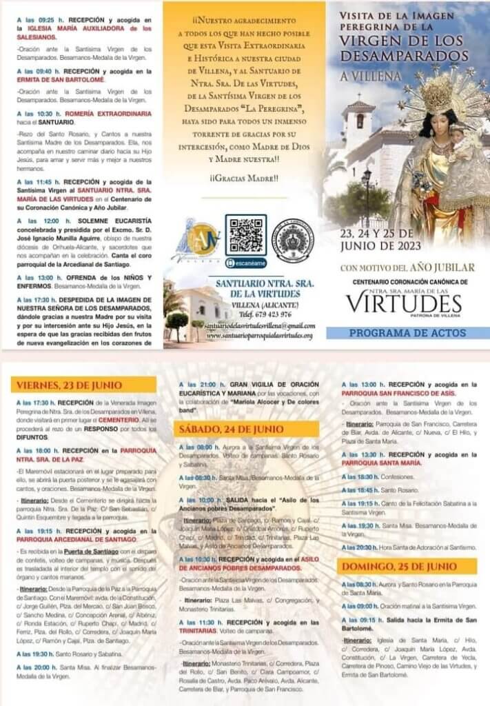 La imagen peregrina de la Virgen de los Desamparados visitará Villena este fin de semana, del 23 al 25 de junio, con motivo del Año Jubilar del Centenario de la Coronación Canónica de la Virgen de las Virtudes, patrona de la localidad alicantina.