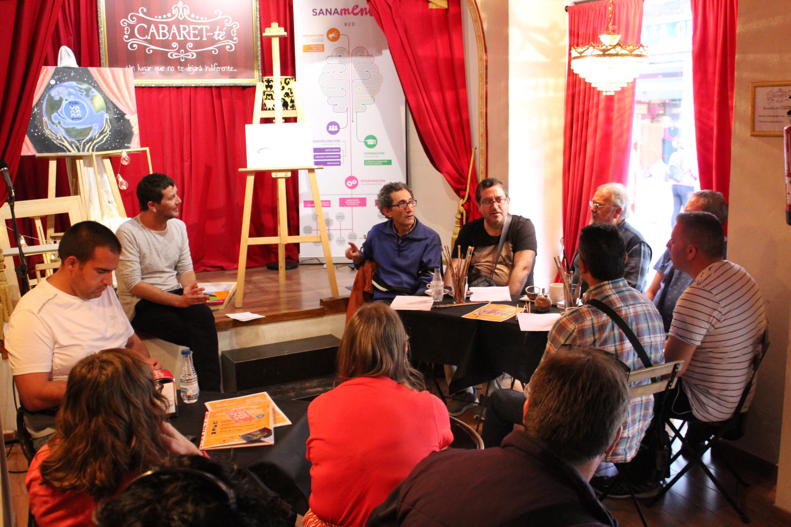 La casa de Pepa, con su ambiente bohemio (decía Mari Paz) nos acogía durante la tarde de ayer miércoles. GRACIAS Cabaret-TE por dejarnos convertirte en un espacio de colores, de artistas, de lienzos, de pinceles, de pintores que pintan la vida a su manera. Porque cada pintor tiene pinta su propio mundo. Y lo descubrimos ayer de sus propias palabras. Fernando, Jose Joaquín, Alejandro, Jose Antonio, Vicente que nos presentaron algunas de sus obras, pero sobre todo nos hablaron de su amor por el color, por la pintura y todo lo que supone para ellos estar en este mundo. Da envidia ver como entre pinceles, oleos, ceras, caballetes encuentran un espacio donde mostrarse, expresar sus emociones, sus ideas. Un lugar donde relajarse y viajar a otros mundos. Mundo como el que nos ha desnudado Pedro Marco, un invitado especial que dice tener sus primeros recuerdos de la pintura en el vientre de su madre. Que ha encontrado un dialogo con sus cuadros y a veces son ellos los que le dicen cuando necesitan más o menos color. “Solo hay que oírlos”, dice. Hoy más que ayer, hemos aprendido que la vida debemos de pintarla del color que más nos guste. Pinta tu vida.