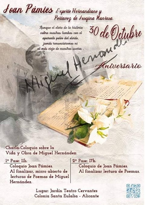 El próximo 30 de Octubre de 2019 con motivo del nacimiento del poeta Miguel Hernández, se le realizará un homenaje en el jardín del Teatro Cervantes de la Colonia Santa Eulalia, donde Joan Pámies, experto Hernandiano y portavoz de Josefina Manresa, desarrollará un coloquio sobre la vida y obra del poeta.